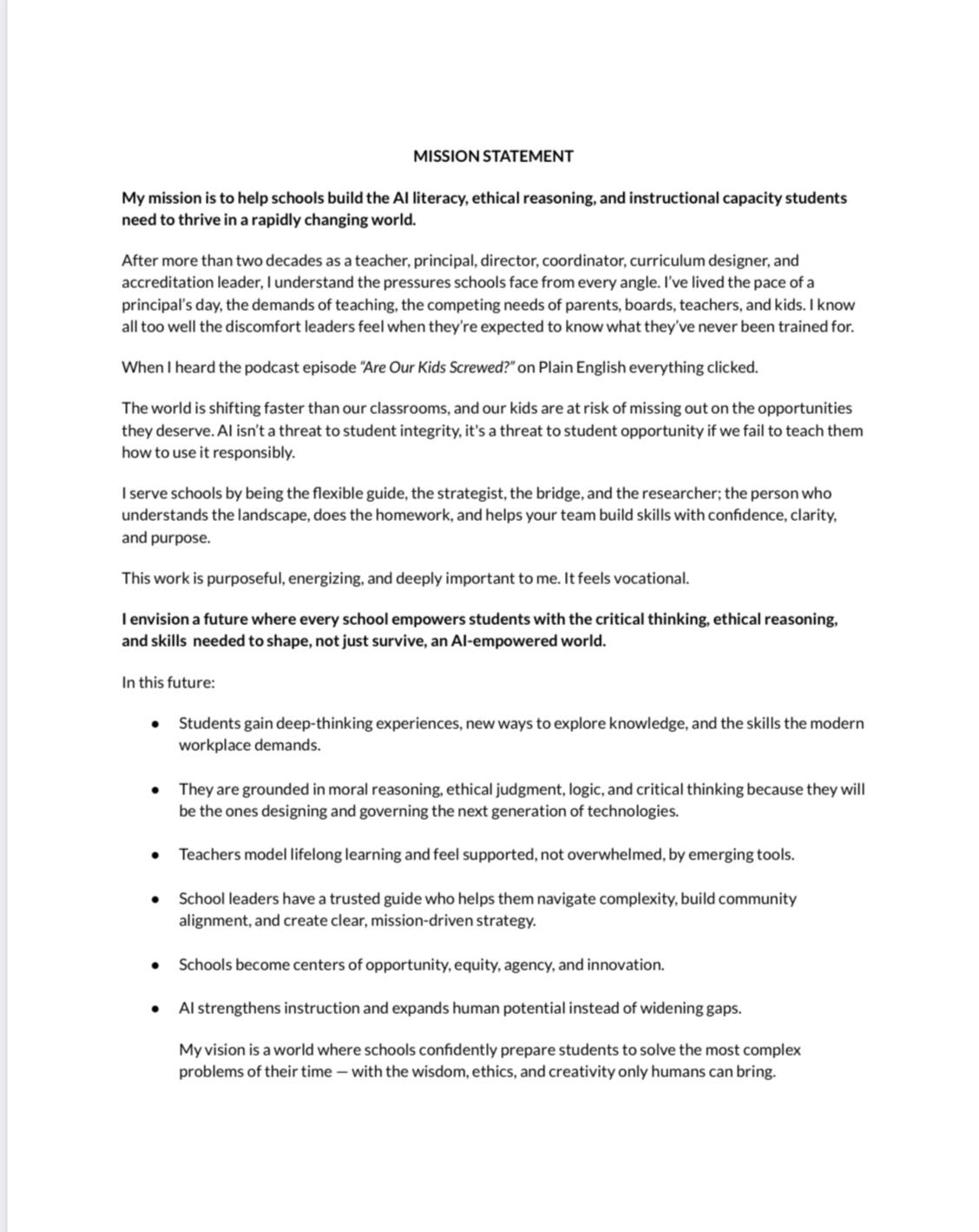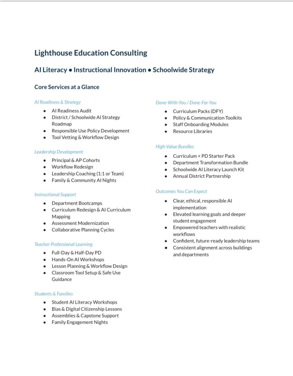 Strategic AI Consulting for Schools, Districts & DiocesesSupport for leaders and curriculum teams as they develop AI guidelines, choose tools, and design sustainable implementation plans focused on student learning and teacher support.